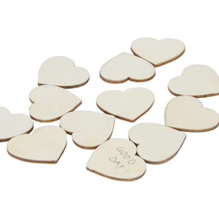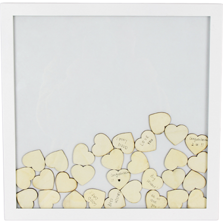 Marco de madera con frontal de cristal + 30 piezas de madera con forma de corazón.