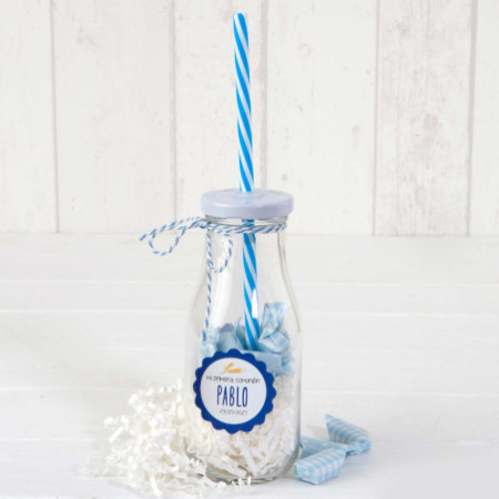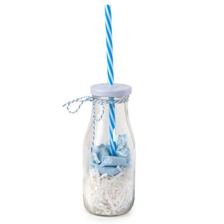 Preciosas botellas de cristal con forma de botella de leche vintage. La tapa es de rosca y pajita de plástico reutilizable.Apto para líquidos y sólidos. Perfectas para recepciones en bodas y otros eventos. Válido para lavavajillas. Se recomienda que la tapa y pajita se lave a mano.Contiene 12 caramelos de sabor afrutado