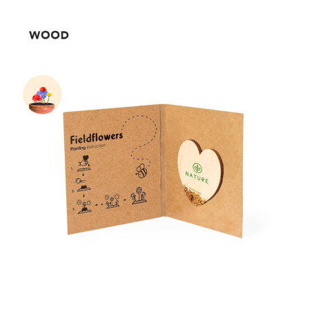 Corazón de semillas fabricado en madera natural, con semillas de flores silvestres listas para plantar.
